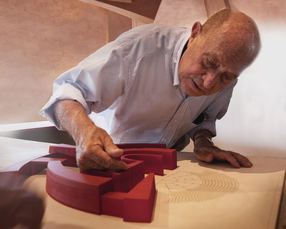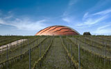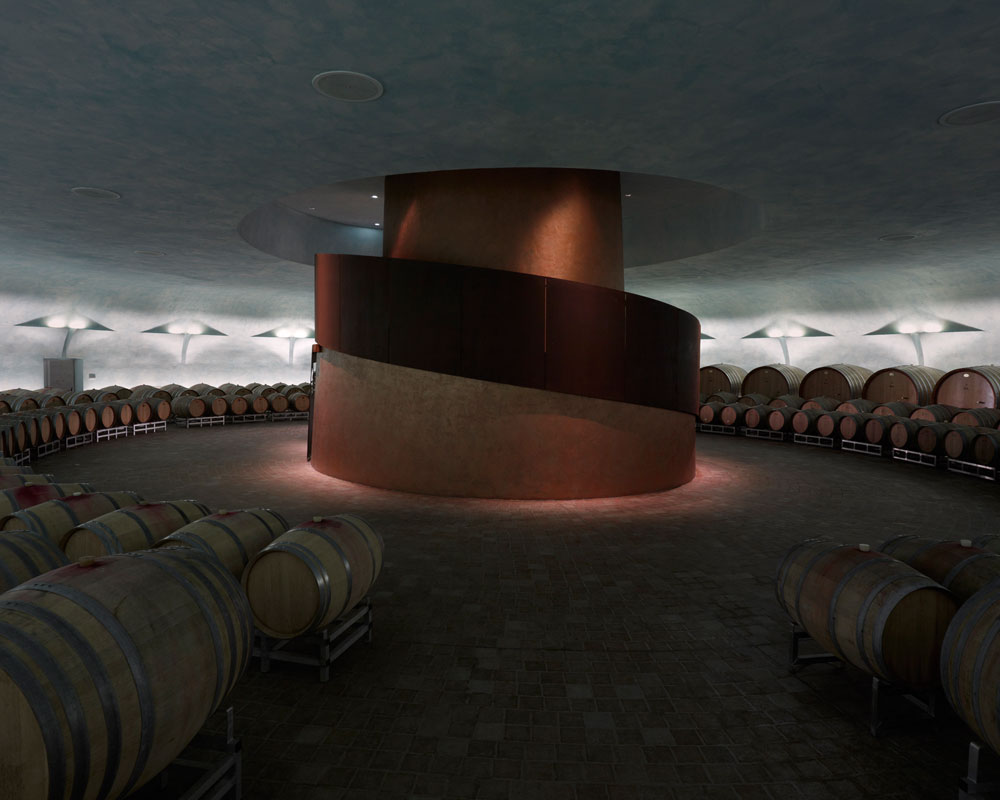 The Carapace is the result of the Lunelli family’s dream of having a winery that is also a treasure chest for wine. From the Lunellis’ long-standing friendship with Arnaldo Pomodoro and their previous collaboration (which had led the great artist to create “Centenarium”, the sculpture that celebrates a century of history of the Ferrari winery) sprang the idea of suggesting that he – whose sculptures adorn important sites all over the world – should design the winery. Pomodoro enthusiastically accepted the challenge of creating a work that called into question the dividing lines between sculpture and architecture and which forged a dialogue both with the outside – the landscape in which it would be inserted – and with what would be inside: with the wine for whose production it had to be strictly functional.