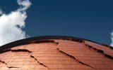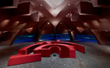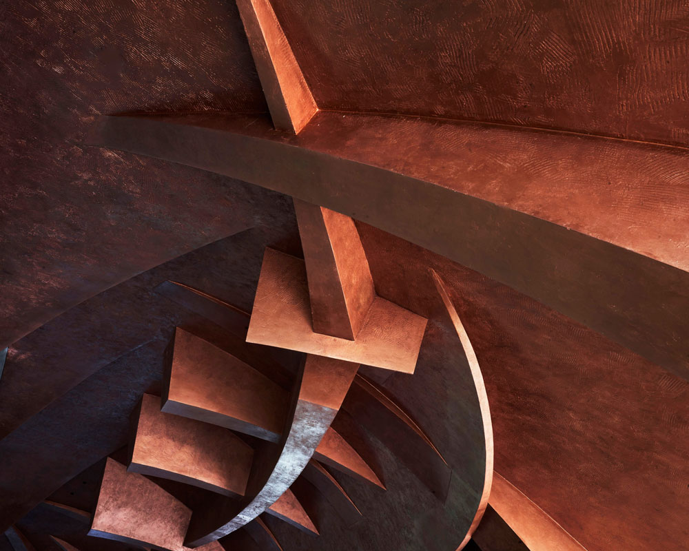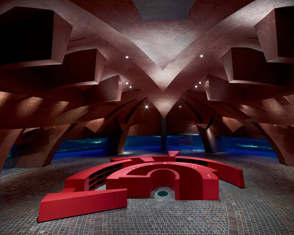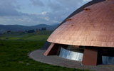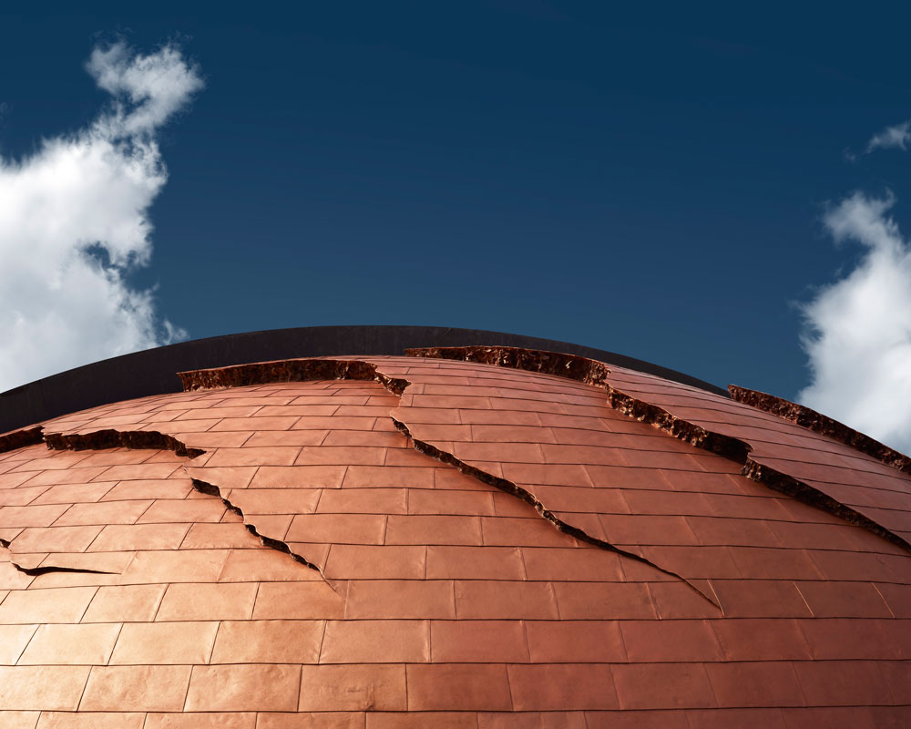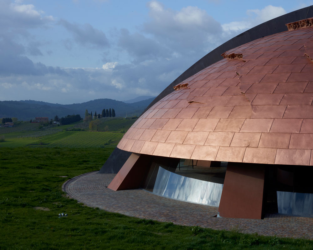 It took six years for the Carapace to be built. The work was performed by a veritable Renaissance workshop under the sensitive guidance of Arnaldo Pomodoro, and, for the more technical aspects, with the highly professional skills of architect Giorgio Pedrotti. The “Carapace” offers itself to one’s gaze as a large copper-covered dome, engraved with fissures that remind one of the furrows in the earth that surrounds it. A sculpted element in the form of a red dart plunging into the soil highlights the work’s place in the landscape.