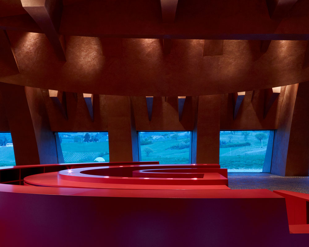 The result is an absolutely unique work of art: the first sculpture in the world in which it is possible to live and work; a place in which art and nature, sculpture and wine intermingle, thus highlighting the exceptional nature both of the container and its contents. Entering the “Carapace” means penetrating into one of Pomodoro’s sculptures, and one is aware right away of his artistic alphabet, which is immediately recognizable in the internal vault. It is a winery that offers great emotions, as indeed was the case for its designer, Arnaldo Pomodoro. He himself describes the fact: “For the first time in my life I felt the excitement of being able to walk, talk and drink inside one of my own works”.